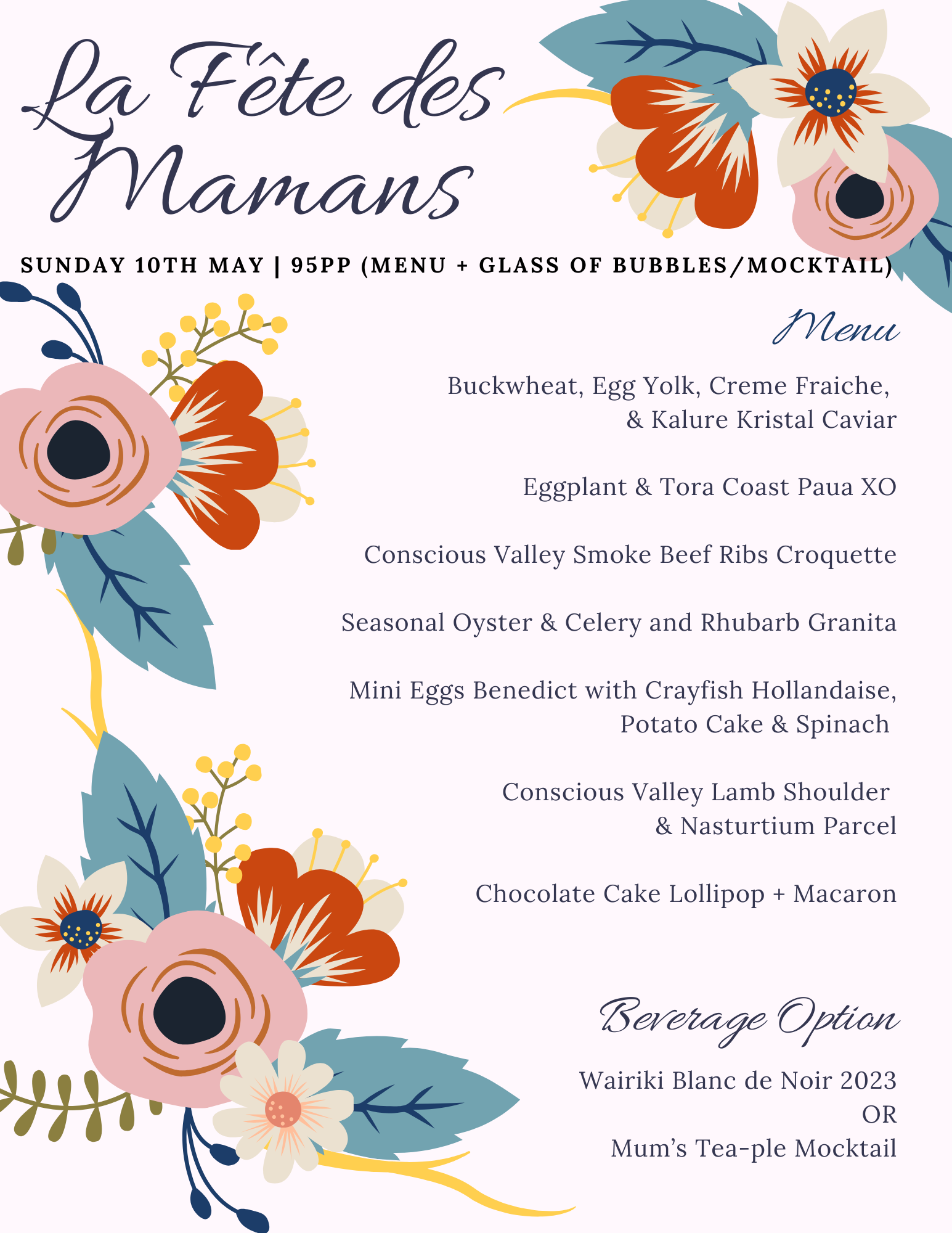 Menu + A Glass of Bubbles/Mocktail $95pp